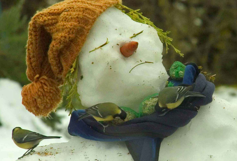 When I opened the front door to put my boots on, here he was, all happy and jolly! He had an old scarf around his neck and a dirty yellow woolly hat with a pompom. A swarm of grey and blue tits were flying to and fro around him. He’d brought them some balls of seeds and there was such a feast going on right under our eyes!